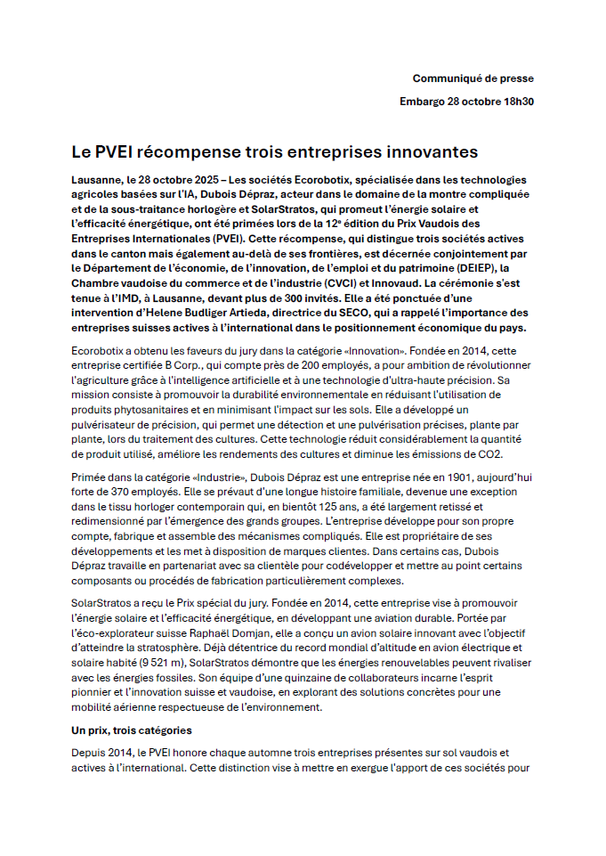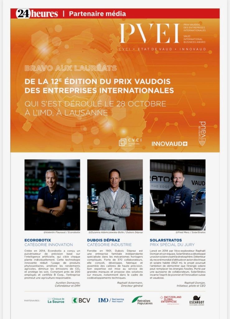 Nous sommes fiers d’avoir été distingués dans la catégorie « Industrie » lors de la 12e édition du Prix Vaudois des Entreprises Internationales (PVEI). Ce prix met en lumière les entreprises vaudoises qui rayonnent au-delà des frontières du canton.