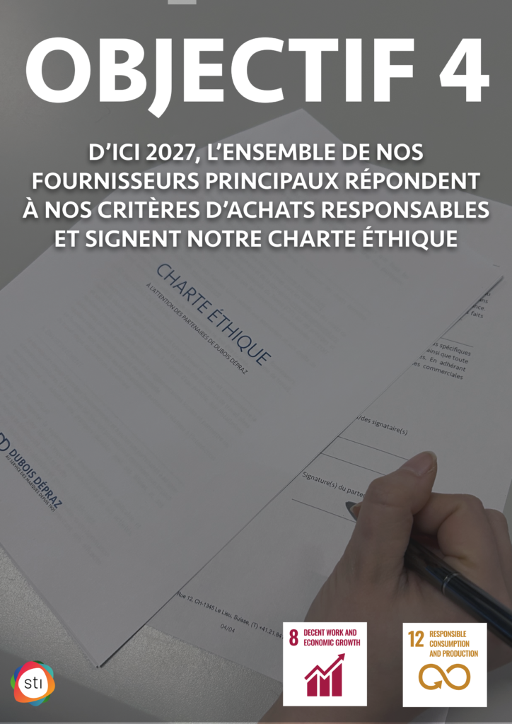D’ici 2027, faire en sorte que l’ensemble de nos fournisseurs principaux répondent à nos critères d’achats responsables et signent notre charte éthique.